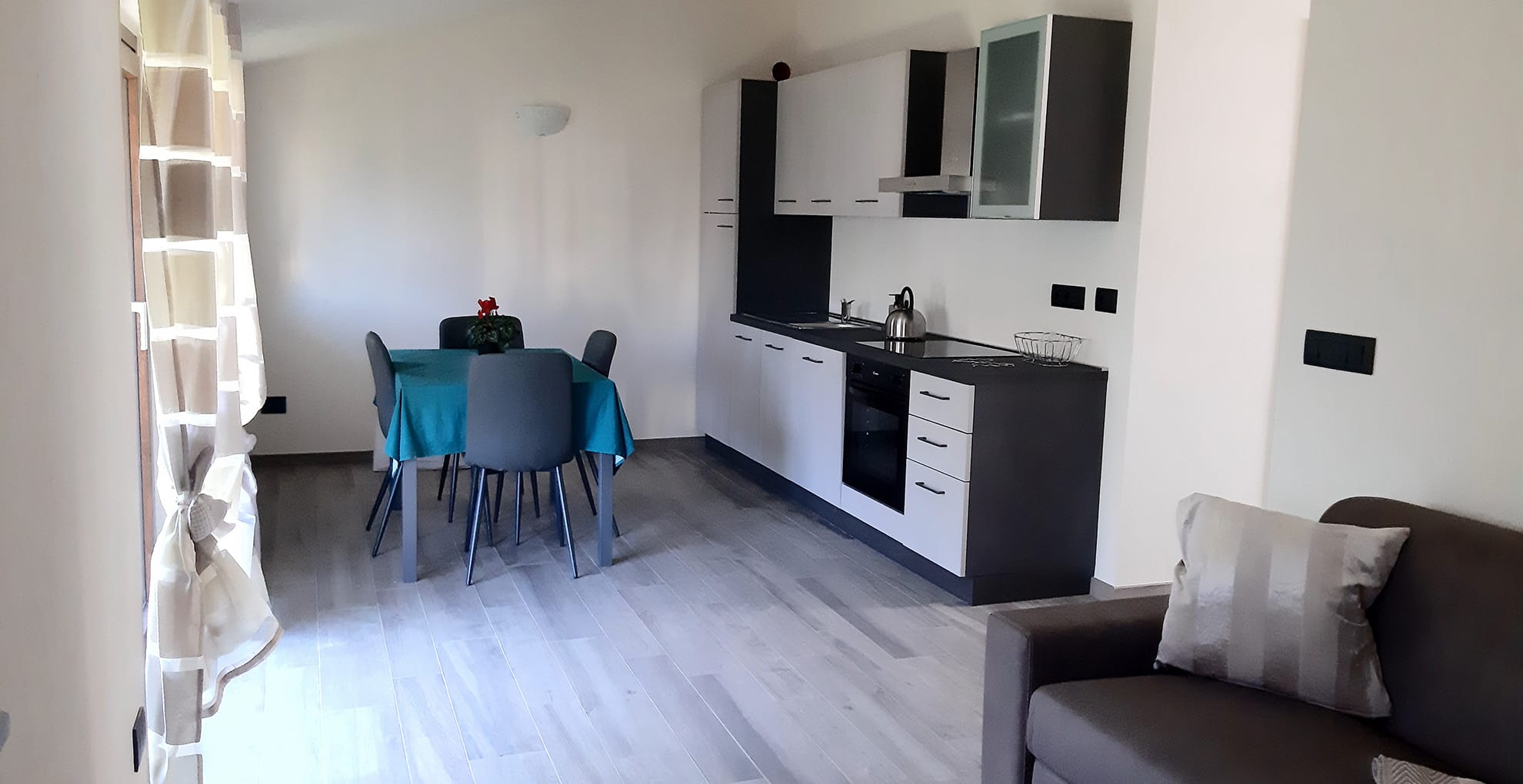 Arredamento accurato e moderno, angolo cottura con fuochi ad induzione, forno, lavastoviglie e macchina per il caffè, camera matrimoniale, cameretta con letti a castello e divano letto in soggiorno, bagno con doccia, asciugacapelli e prodotti di cortesia, totale 6 posti letto.