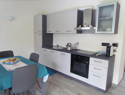 La cucina è dotata di forno, fuochi ad induzione, macchina per il caffè, lavastoviglie e frigorifero, bagno con doccia, asciugacapelli e prodotti di cortesia, cambio settimanale di biancheria e asciugamani.